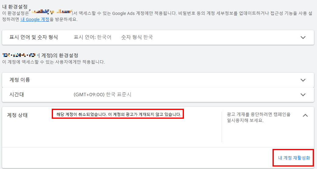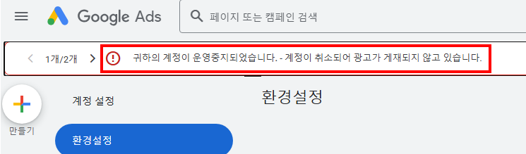 귀하의 계정이 운영중지되었습니다. -계정이 취소되어 광고가 게재되지 않고 있습니다.