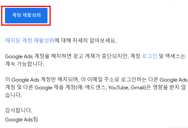 고객님의 Google Ads 계정이 해지되었습니다.