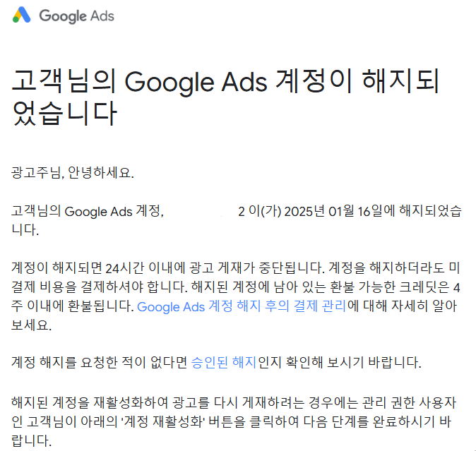 고객님의 Google Ads 계정이 해지되었습니다.