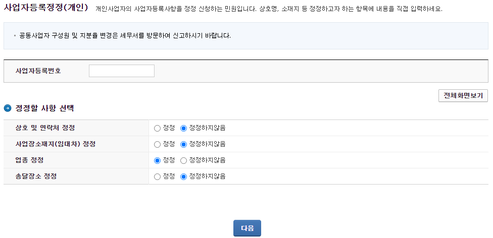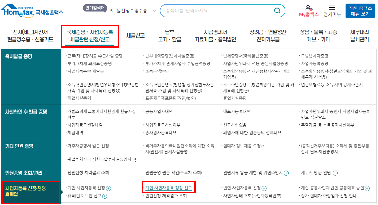 국세증명.사업자등록 세금관련신청/신고 -> 사업자등록 신청,정정,휴폐업 -> 개인사업자등록정정신고 클릭.