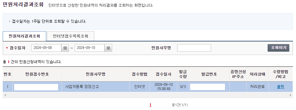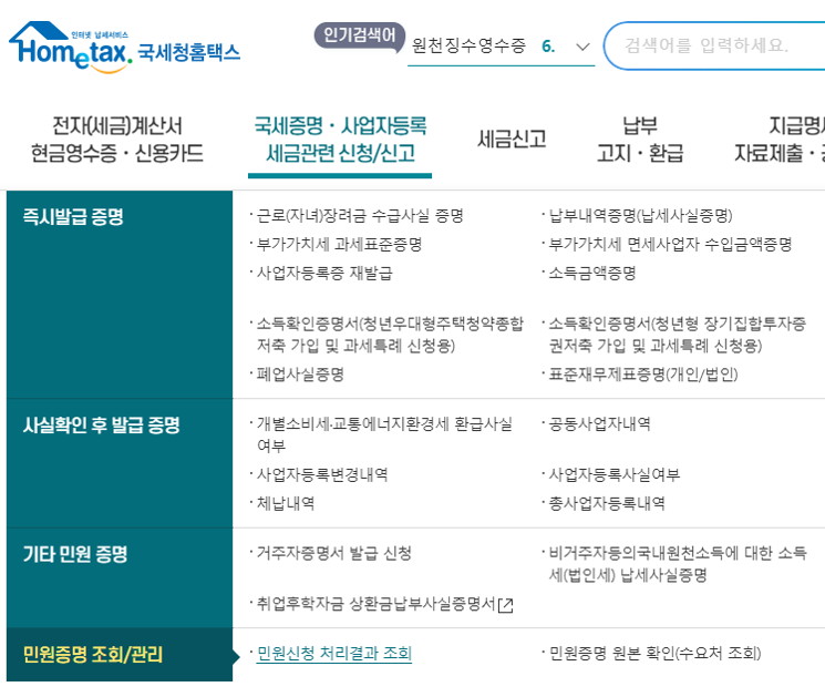 홈택스 민원증명 조회/관리 - 민원신청처리결과조회에서 처리된 사업자등록증을 확인할 수 있습니다.