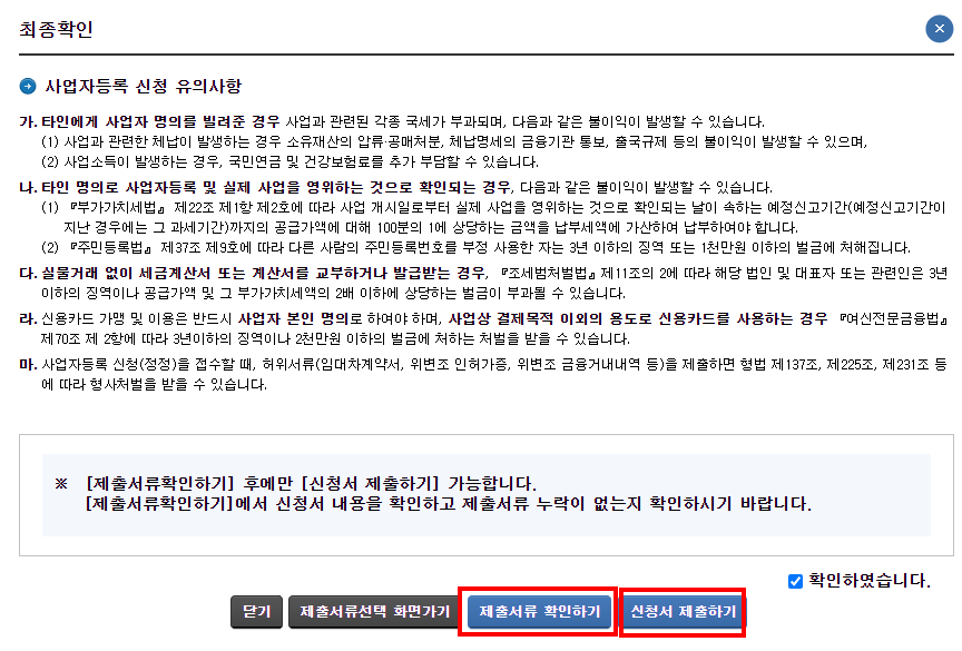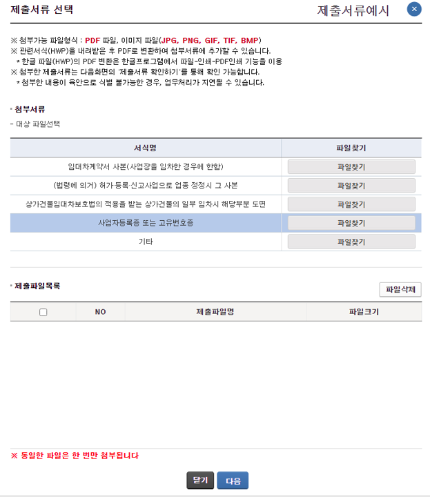 저장 후 다음을 클릭하면 제출서류 팝업창이 뜹니다.