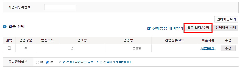 사업자등록증을 출력하니, 업체, 종목이 추가되었어요.