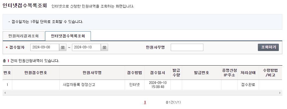 홈택스 민원증명 조회/관리 - 민원신청처리결과조회에서 처리된 사업자등록증을 확인할 수 있습니다.