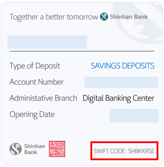 저는 신한은행 계좌로 등록했는데요, 신한은행 SWIFT 식별코드는 SHBKKRSE입니다.