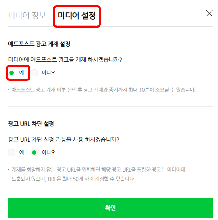 애드포스트 광고 게재 설정에서 예를 선택.