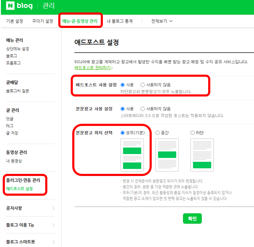 블로그관리 -> 메뉴,글,동영상관리-> 플러그인,연동관리 -> 애드포스트설정 -> 애드포스트 사용 설정에 체크.