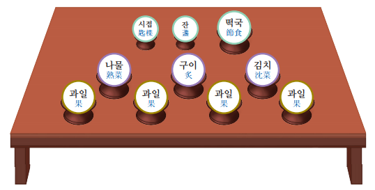 우리가 흔히 과일 놓는 법으로 홍동백서, 조율이시를 알고있는데요, 이는 예법을 다룬 어떤 문헌에도 이런 표현은 없습니다. 과일은 4~6가지 정도를 편하게 배치해서 놓으면 됩니다.