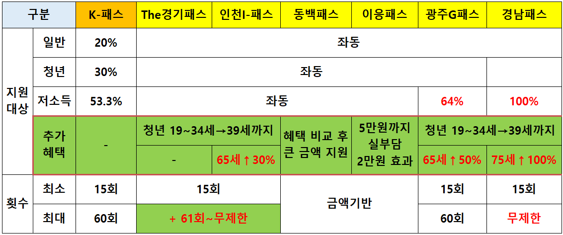 또한 인천패스 광주G패스, 경남패스는 청년 나이가 39세 까지이고, 65세 이상 고령층에 대한 할인 혜택이 더 높습니다.