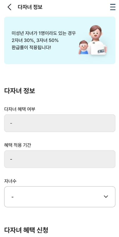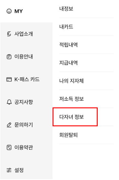 다자녀 할인은 K패스앱이나 홈페이지에서 My메뉴 -> 다자녀정보에서 자녀 등록하고 이용하면 됩니다.