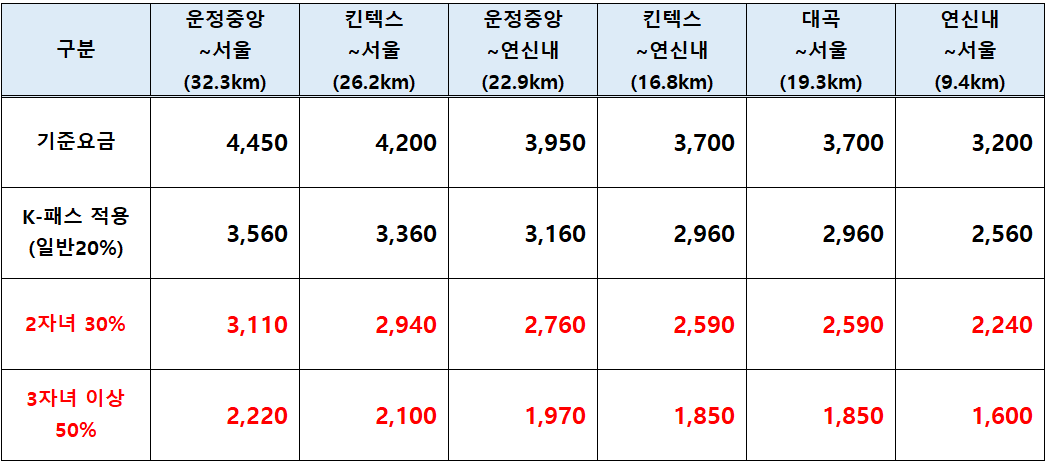 24년12월28일 GTX A 파주운정중앙~서울역 구간이 개통했습니다. 운정-서울역 구간 요금 기준이 4,450원인데 K패스 3자녀 할인을 받으면 50%인 적용이 되어 2,220원으로 이용 가능합니다. 만약 왕복으로 20일 GTX A 이용한다면 월 89,000원 정도가 환급되는 것입니다.
