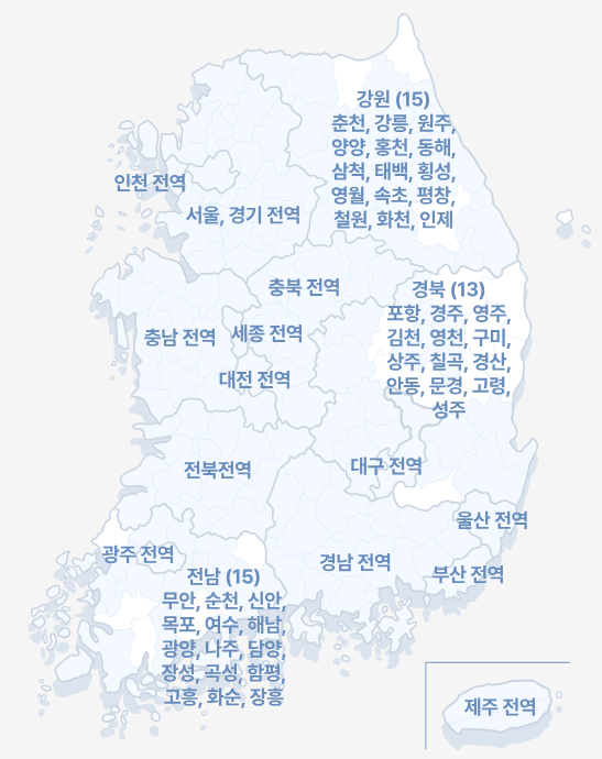 경북 : 청송, 청도, 의성, 울진, 울릉, 예천, 영양, 영덕, 봉화.
