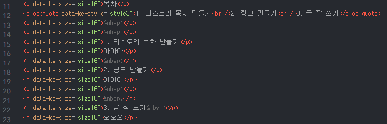 위 html모드 화면에서 각 제목 번호에 해당되는 15번, 18번, 22번 행의