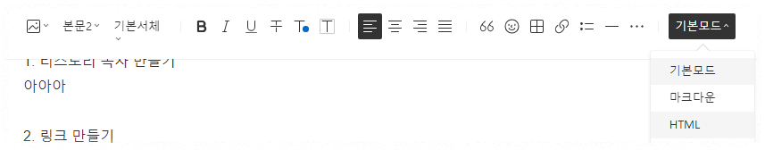 티스토리 블로그 상단 맨 오른쪽에 [기본모드] -> HTML 선택을 해줍니다.