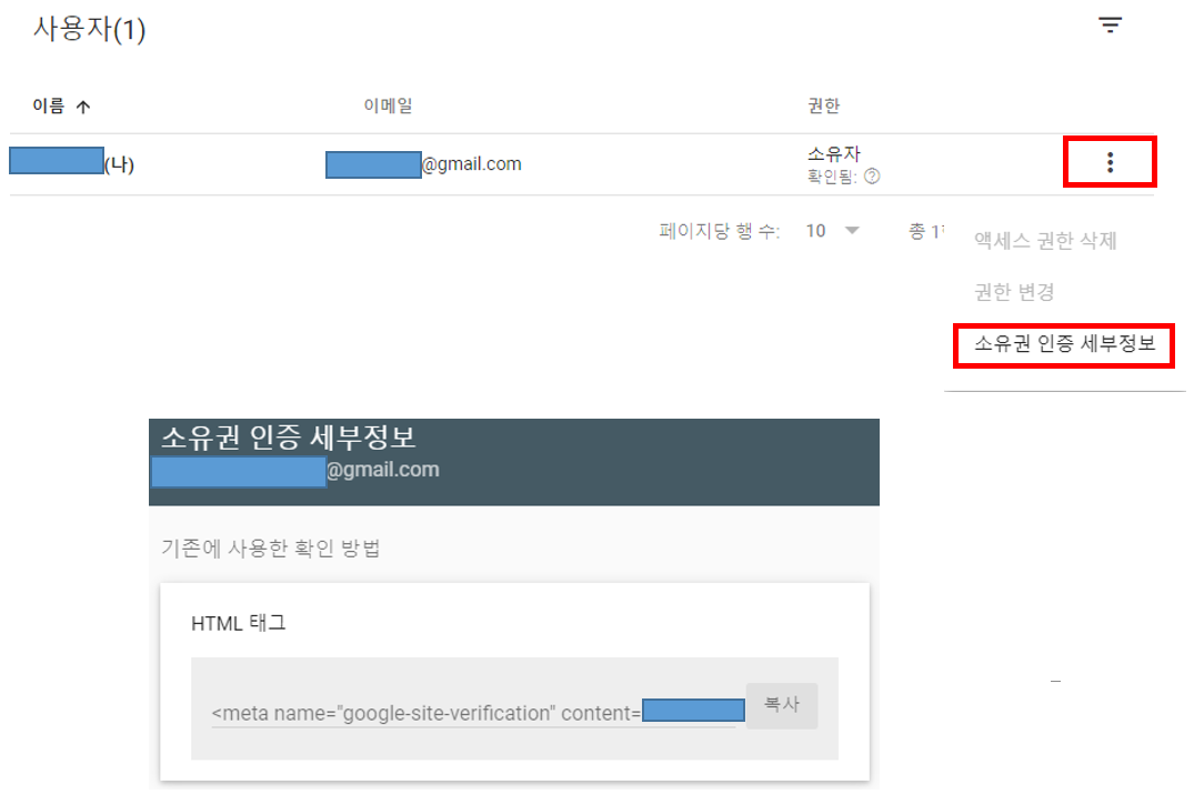 구글서치콘솔 접속 -> 설정 -> 사용자 및 권한 클릭 -> 소유권인증 세부정보 클릭